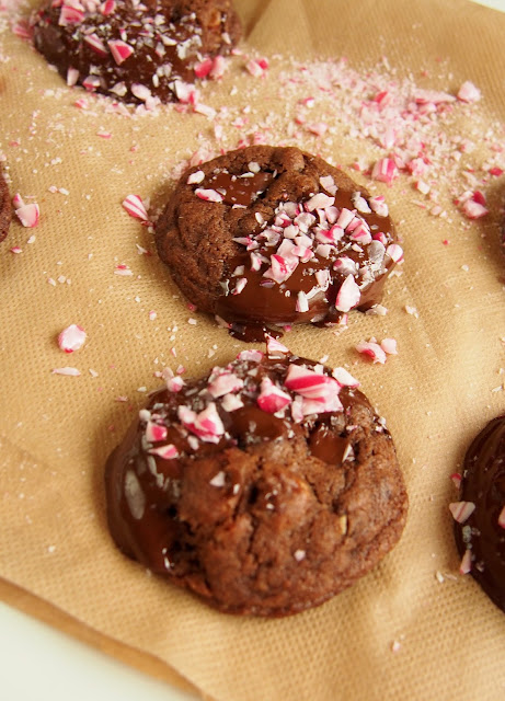 7. Jos tahdot koristella keksit suklaalla ja karkkimurskalla, anna niiden ensin jäähtyä ja sitten dippaa suklaassa ja ripottele pintaan murska! Anna jähmettyä. Säilyy ilmatiiviissä rasiassa kolmesta neljään päivään.