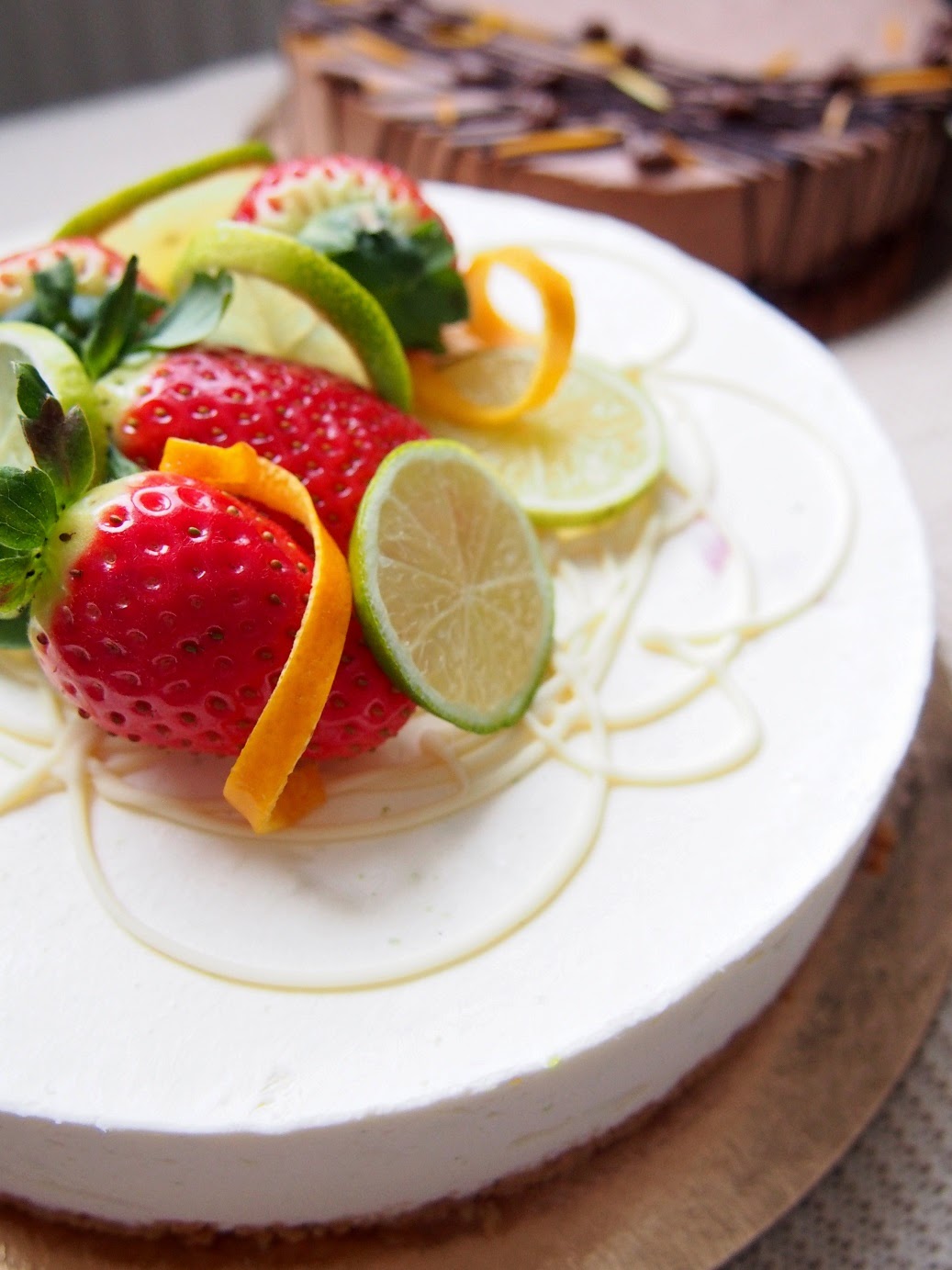 (Pohjan teimme kaurakekseistä ja lisäsimme massan sekaan limeraastetta ja mehua, sekä tuoreita mansikoita palasina)