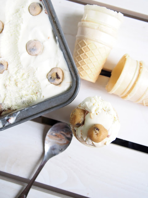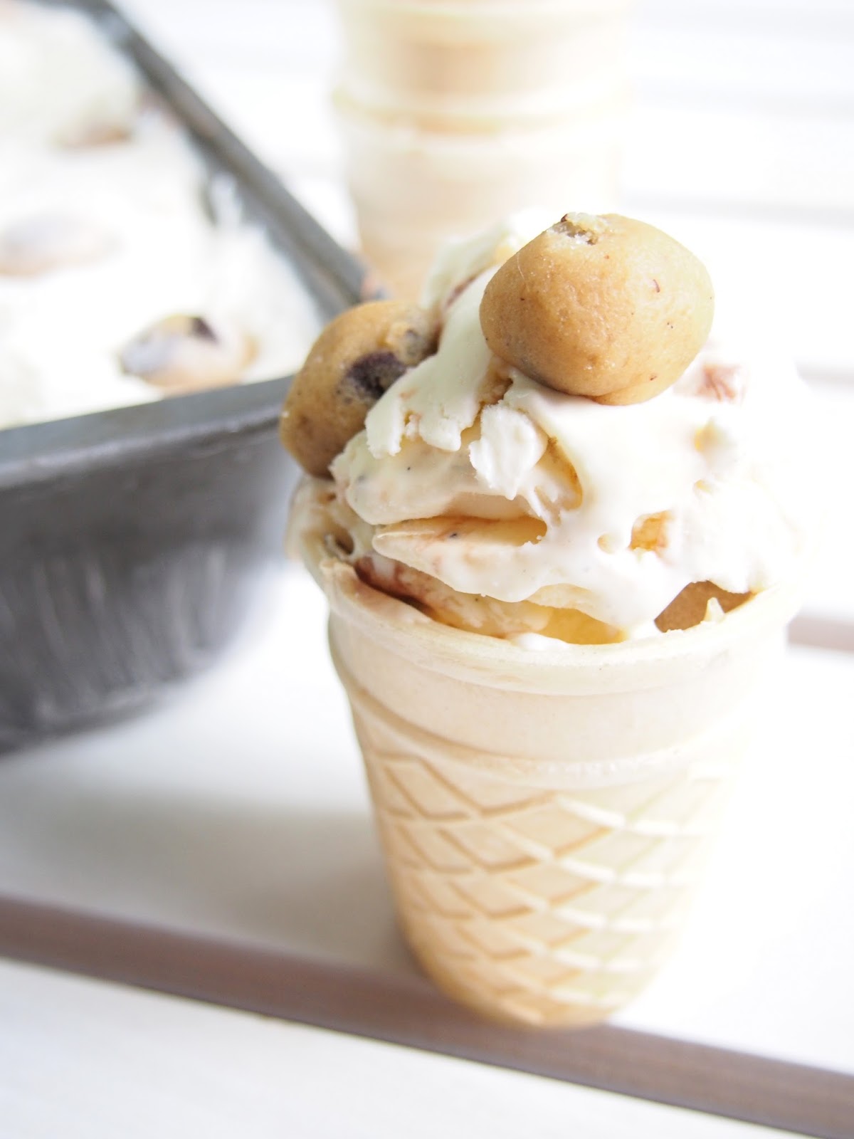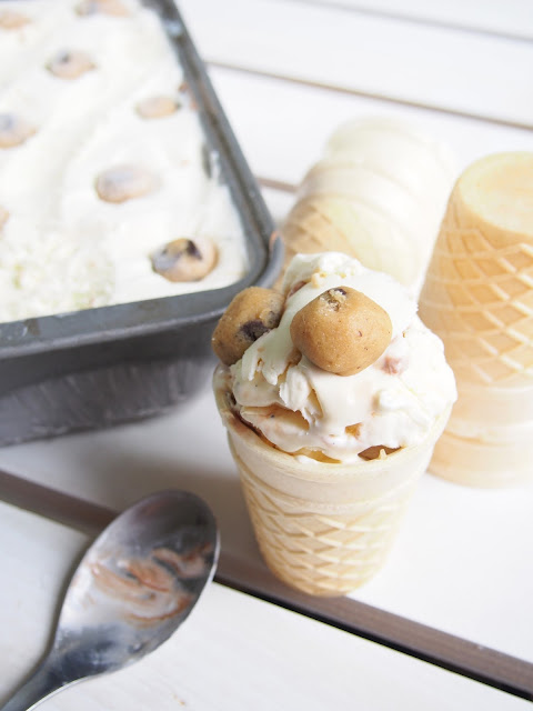 Vaikka keittiöremppa veikin uunit ja hellat, jotain kylmää sai tehtyä pakkaseen. Ihana helppo jäätelö ja herkullisia keksipalleroita seassa, täydellistä! Ben&Jerry’sin cookie dough jäätelö on klassikko jenkeissä ja tämä onkin sen inspiroima!