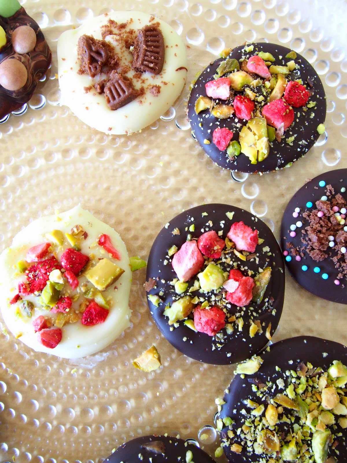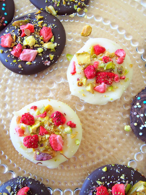 Kannattaa sulattaa suklaa mikrossa (tai vesihauteessa) ja pursottaa pursotinpussilla leivinpaperille dominokeksin kokoisia nappeja. Lisää päälliset vielä kun suklaa on märkää. Anna jähmettyä pöydällä varjoisessa. Nämä kannattaa tehdä joko samana päivänä tai korkeintaan pari päivää ennen tarjoilua 🙂