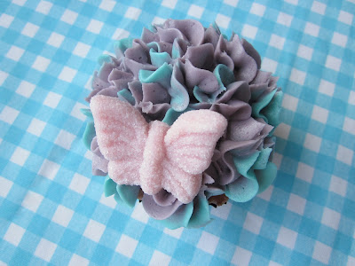 Kuppikakkujen pohjana tosiaan toimi eiliset mustikkamuffinit ja ne sopivatkin buttercreamin kumppaniksi loistavasti! Kuppikakkuihin pyrähti myös Karkkikauppa Sweetheartista saadut perhoskarkit!