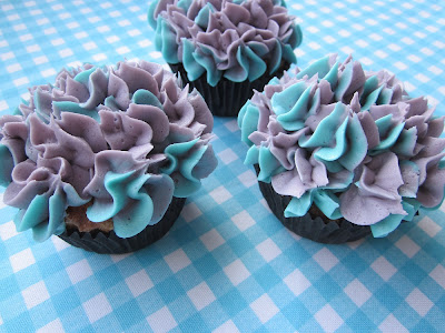 Kuorrutteena toimi tälläkin kertaa hyvin pursoittuva buttercream. Itse värjäsin buttercreamin lilalla ja sinisellä, ja sen jälkeen laitoin kumpaakin samaan pursotinpussiin (kaksivärisen kuorrutteen saamiseksi). Sinistä laitoin jonkun verran vähemmän. Pursotukset tein yksitellen tähtityllalla.