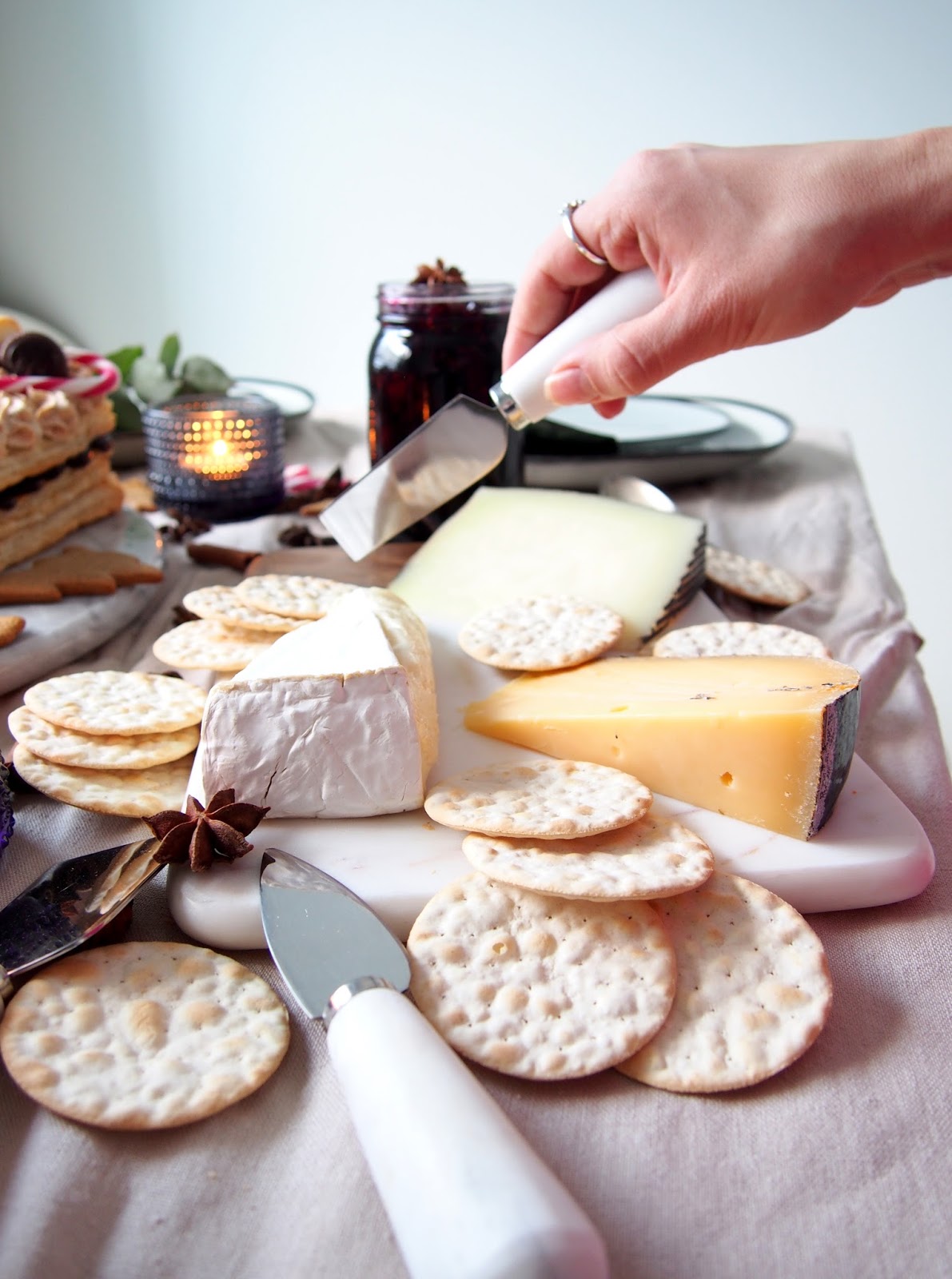 …Pöydän koristelussa käytettiin eucalyptusta, havuja, joulumausteita ja karkkikeppejä. Saimme Ellokselta yhteistyön kautta kattaustarvikkeita ja linkitämme tuotteet alas! Juustoveitset ehdittiin ikävä kyllä myydä loppuun 🙁 Vielä ehtii tilata jotain ihanaa keittiöön, itselle tai lahjaksi 😉