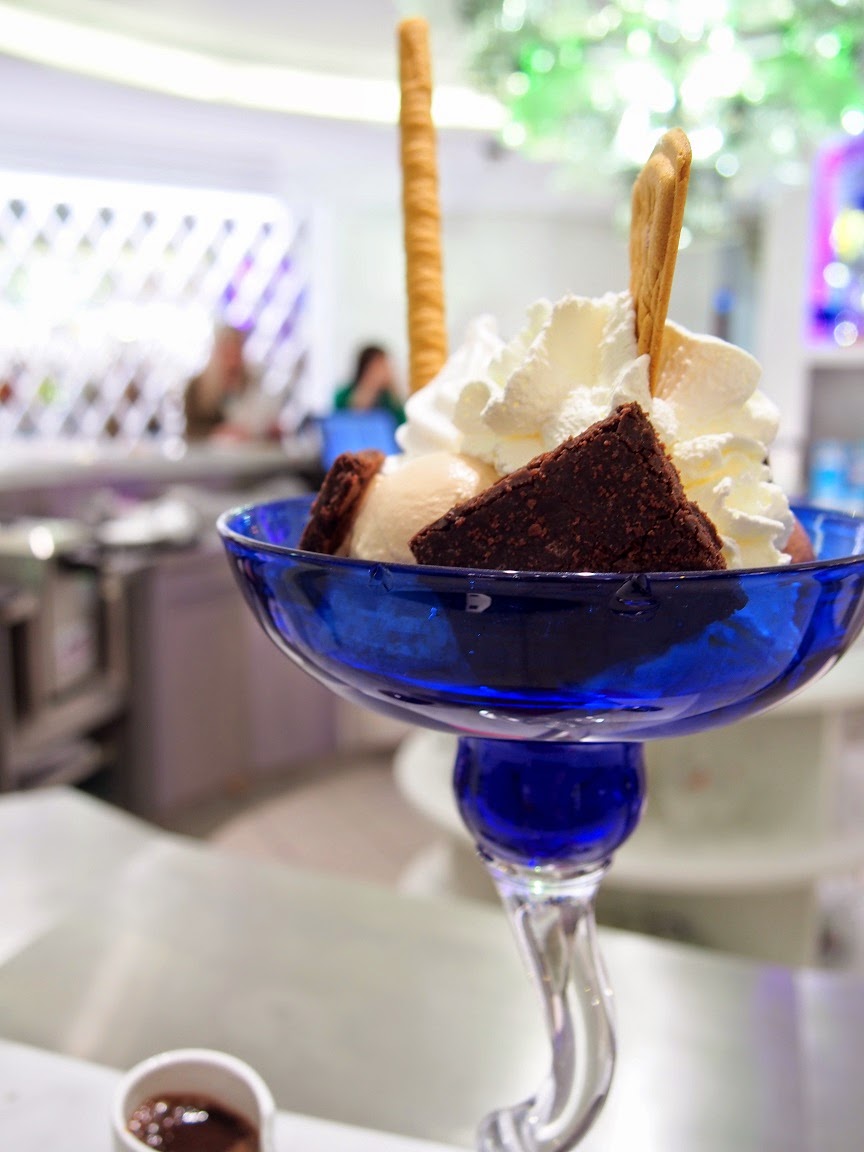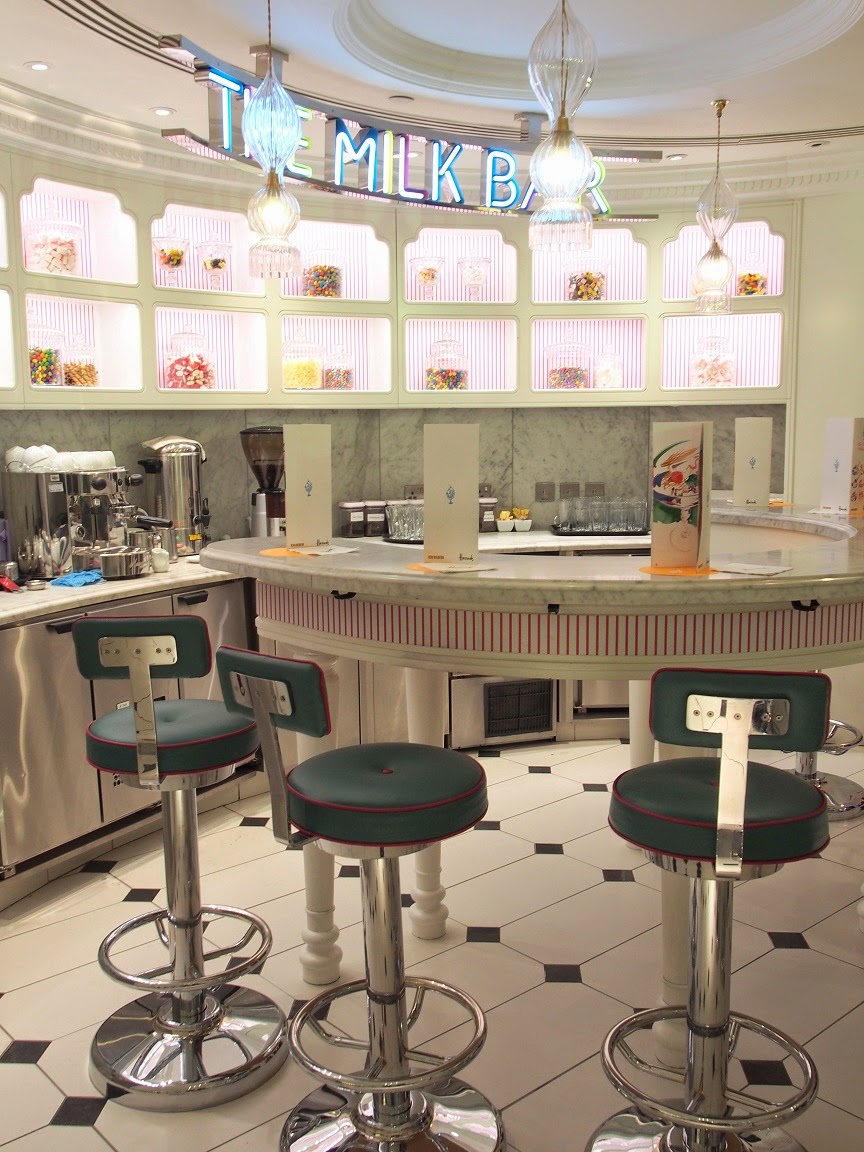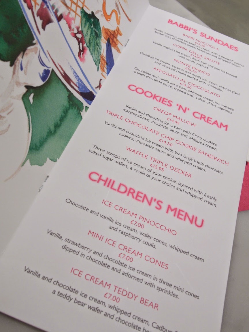 Kolme kertaa Lontoossa käyneenä, paikat on tullut melko tutuksi, mutta ylemmässä kerroksessa Harrodsia osuimme paikkaan missä emme olleet käyneet. Ice Cream Parlour niminen paikka oli ihana. Diner-tyylinen jätskibaari oli tunnelmallinen ja hauska. Meidät ohjattiin siellä pöytään ja meille tuotiin menut. Tarjoilija suositteli meille suosituimpia annoksia ja palasi pian hakemaan tilauksemme.