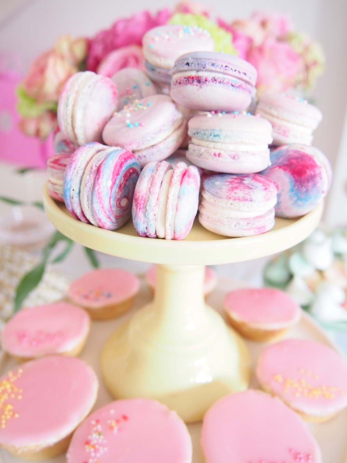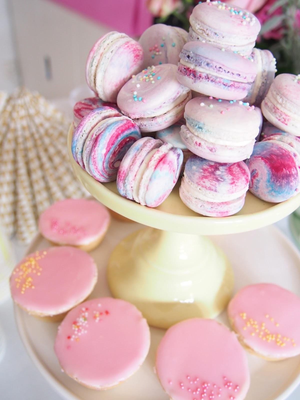 Näissä kauniisti värjätyissä macaron-leivoksissa oli muuten täytteenä ihana vaniljainen buttercream ja osassa buttercreamiin oli sekoitettu herkullista ruusuvettä!