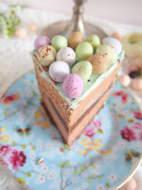 Tässä kakussa yhdistyy ihana browniepohja, mignon-mousse & marenkikreemi <3 päällinen sai koristeeksi ihanat pisteet ja pikkuisia suloisia suklaamunia.