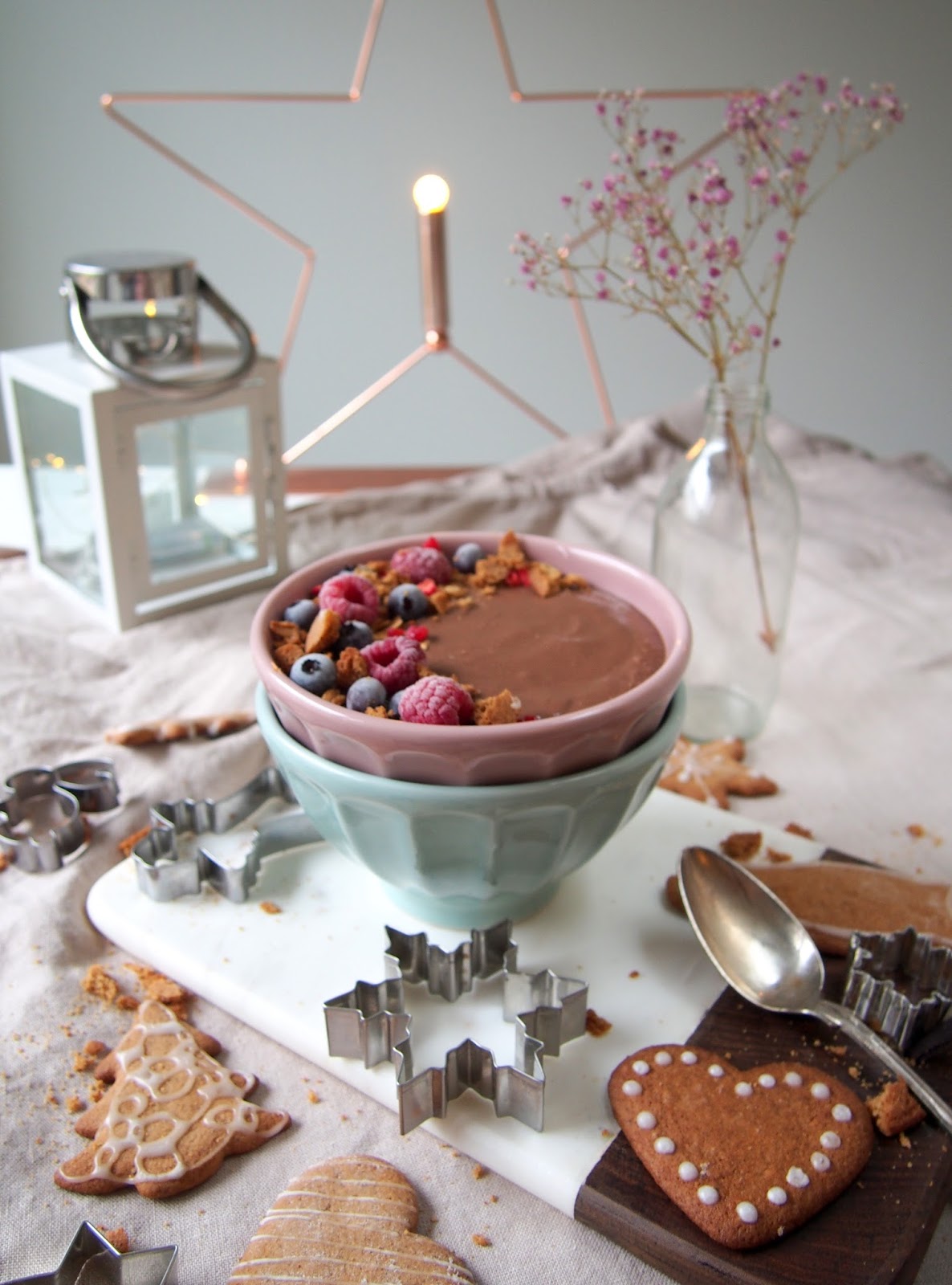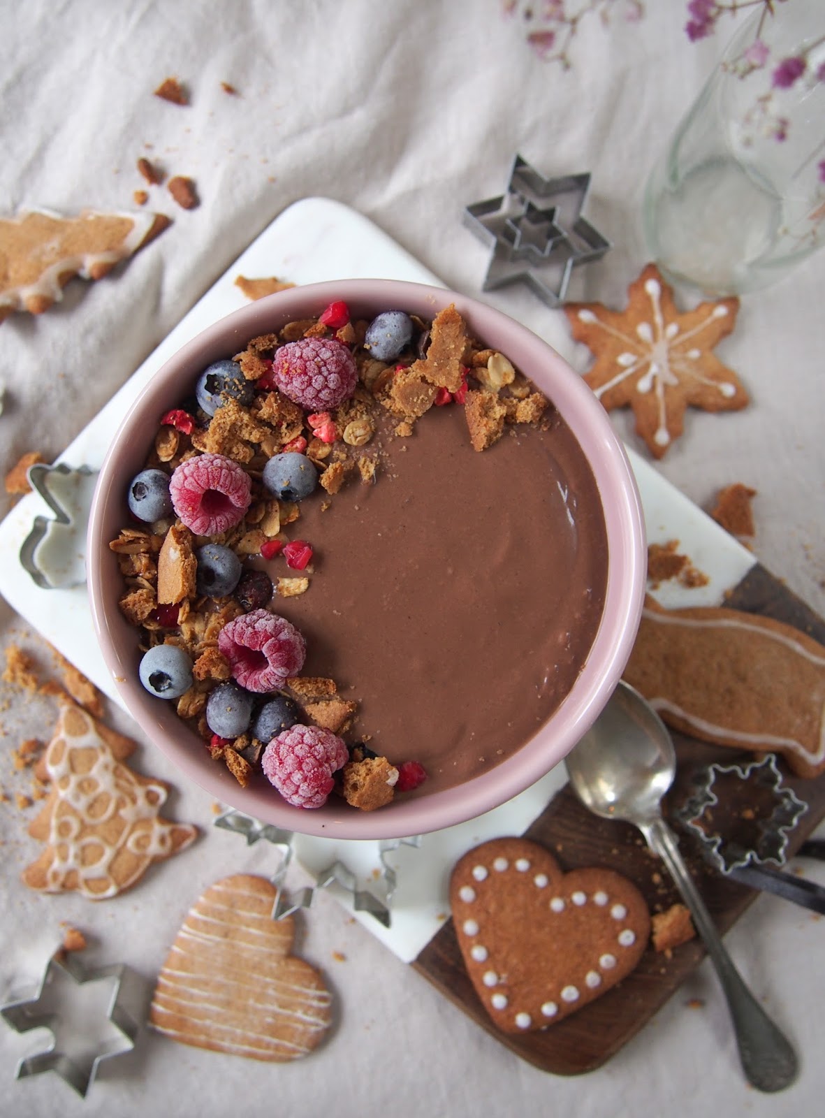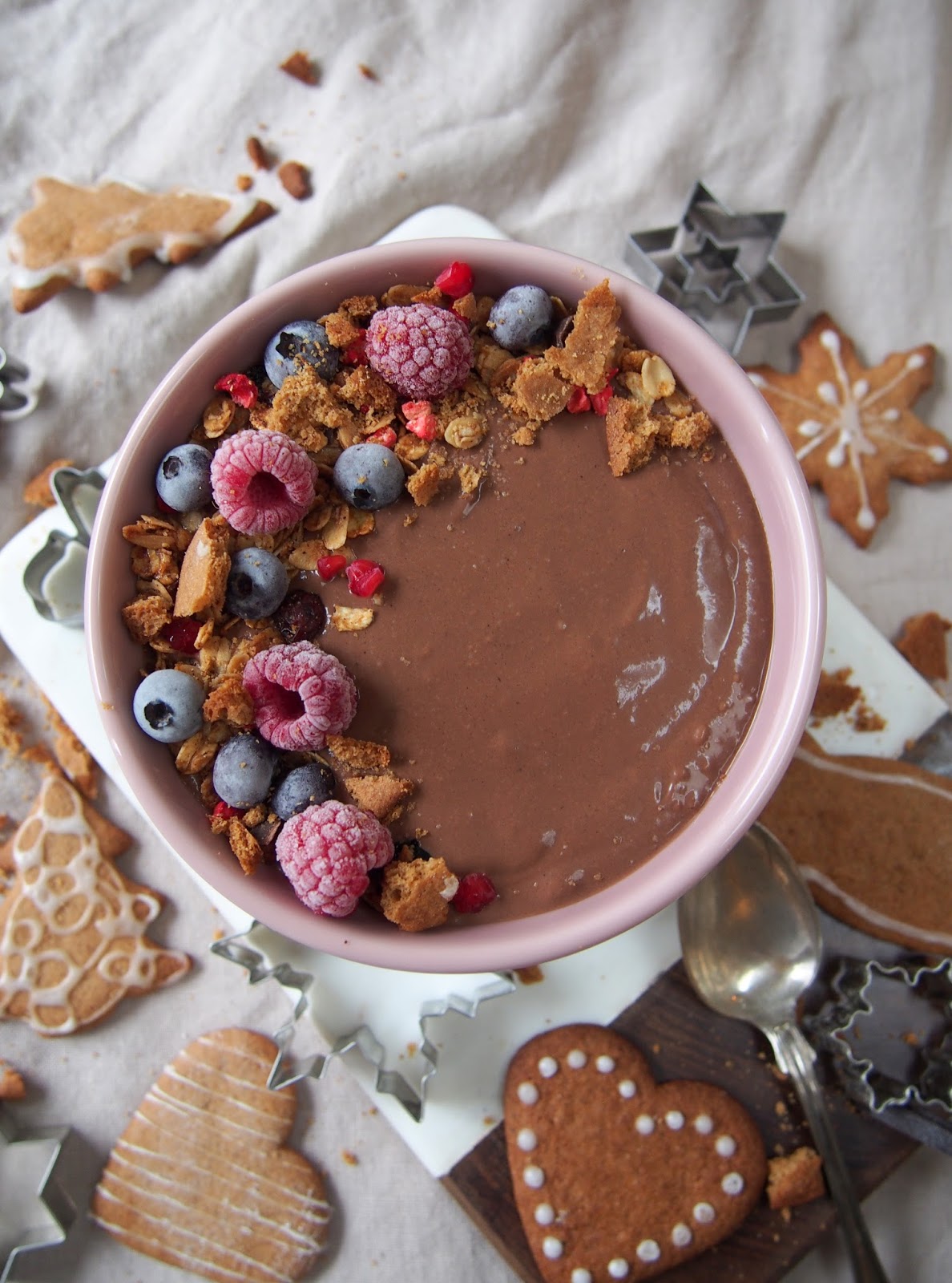 Suklaiset smoothiebowlit on aika hyviä pitämään makeannälän ja varsinkin suklaanhimon poissa. Jouluisen version saa lisäämällä smoothiebowliin suklaan lisäksi hieman piparkakkumausteita! Herkun kruunaa itsetehty granola! Näin syntyy helppo ja herkullinen, piparinen smoothiebowl.