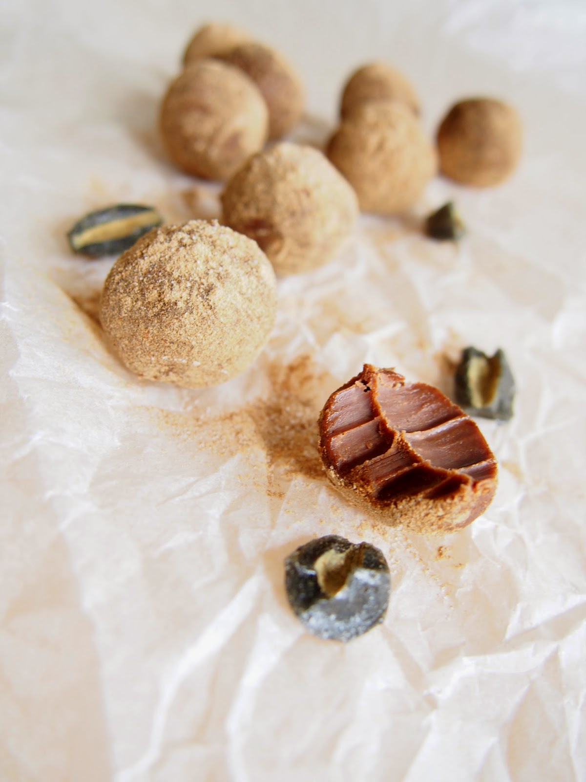 6. Pyörittele jähmettyneestä suklaamassasta palloja ja pyörittele salmiakkijauheessa (myös esim turkinpippurirouhe toimisi).