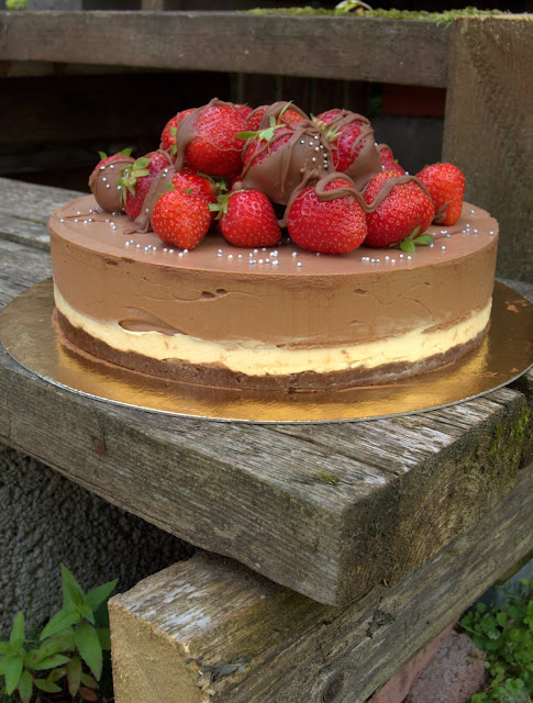 Teimme kakun kaksiosaisena, alla kinuskinen juustokakku ja päällä herkullinen suklaamousse.