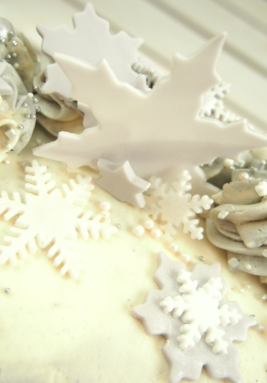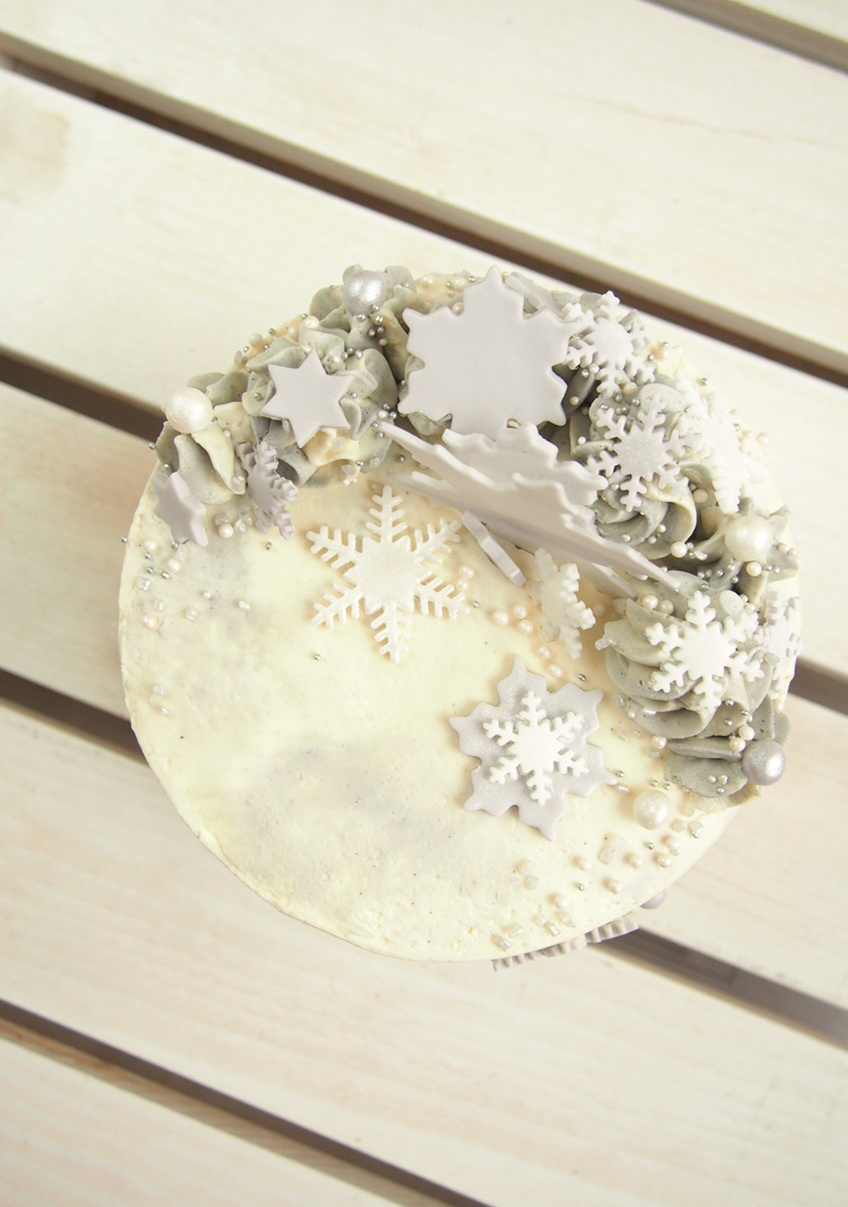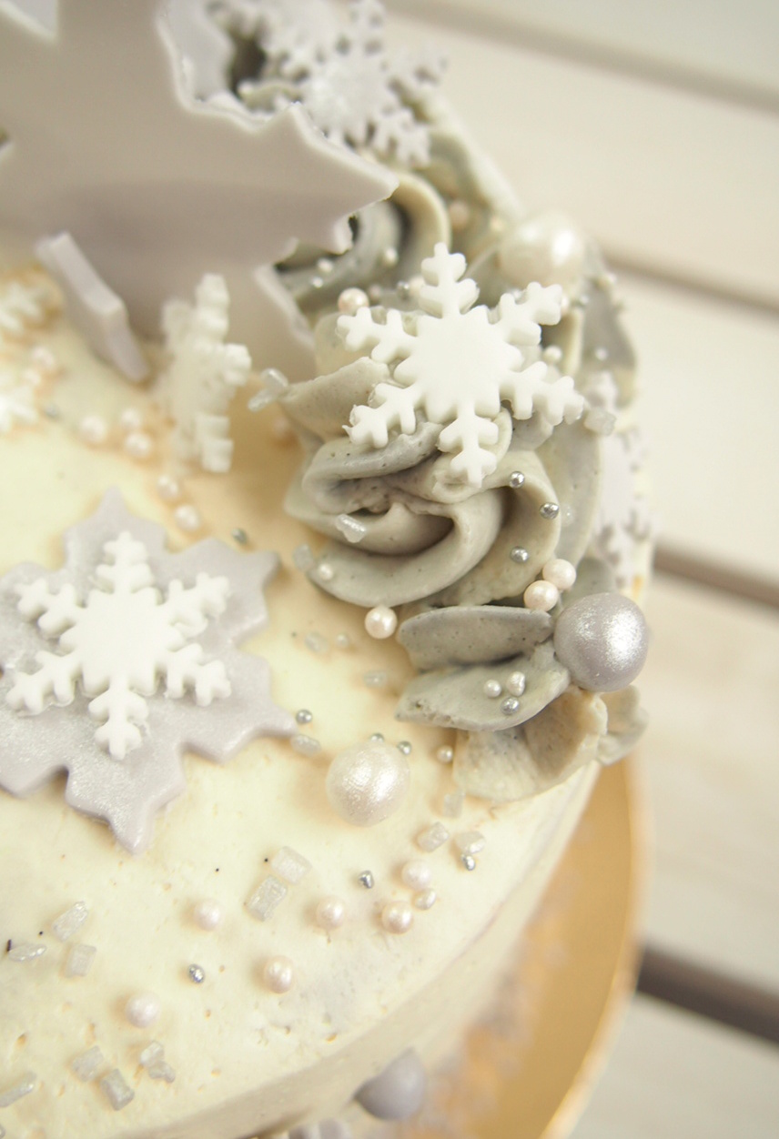 Tänään teimme ihanan talvisen, lumihiutalein koristellun kakun. Huurteisesta teemasta huolimatta kakun sisältö on pirteä – mansikkaa ja sitruunaa. Kakkupohjana toimi tämä tuttu ohje! Ja kuorrutteena toimi tämä marenkivoikreemi (värjäsimme harmaan värin mustalla pastavärillä!).