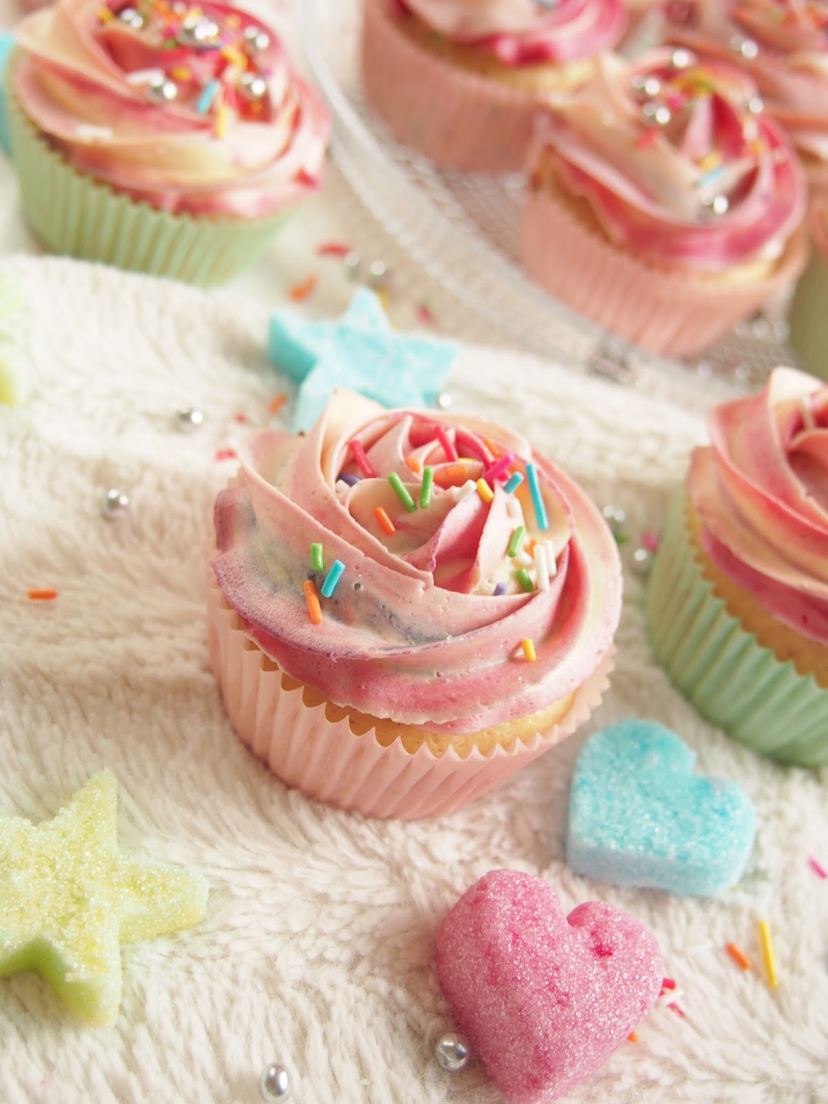Huomenta! Nämä unicorn cupcaket taiottiin blogimme 6-vuotiaan taipaleen kunniaksi! …vastahan me aloittelimme ja jo kuusi vuotta on kulunut! Kiitos kaikille jotka ovat pysyneet herkkumatkallamme mukana 🙂 näissä kuppikakuissa yhdistyy ihanan kostea vaniljainen muffinipohja ja herkullinen valkosuklainen kuorrute. Mietimme hetken, että olisimmeko värjänneet pohjankin, mutta päädyimme heittämään vaniljataikinan sekaan strösseleitä! Ja ne värjäsivät taikinan kauniisti <3 nyt ohjeeseen!