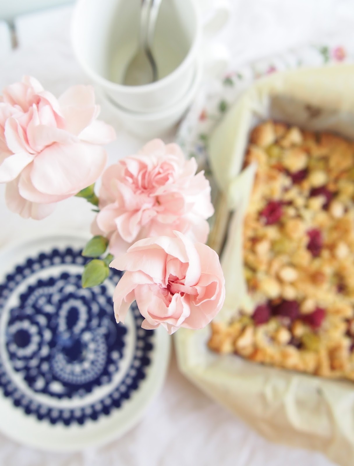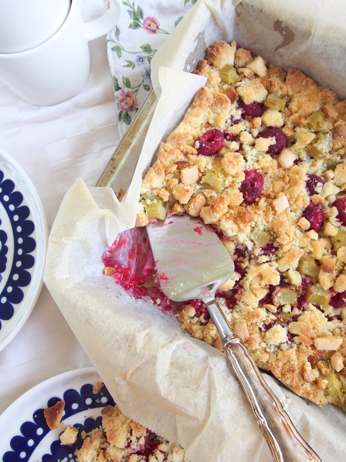 Tämä on nyt sitten sellainen herkku, että tämän voi tehdä kuin yllätysvieras ilmoittaa tulevansa kylään tunnin sisällä 😉 Hapan raparperi ja vadelma sopii täydellisesti yhteen paahdetun valkosuklaan kanssa ja tästä täydellisestä makukombosta on kiittäminen Sweet Food O’Minen Saria 😉 ilman sinua valkosuklaa ei olisi päätynyt paistokseen!