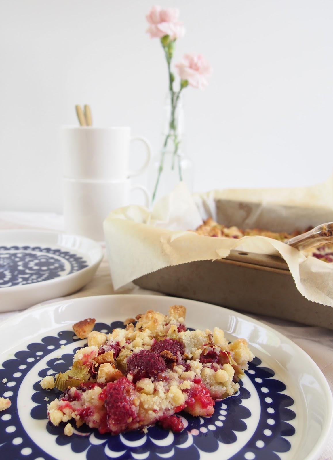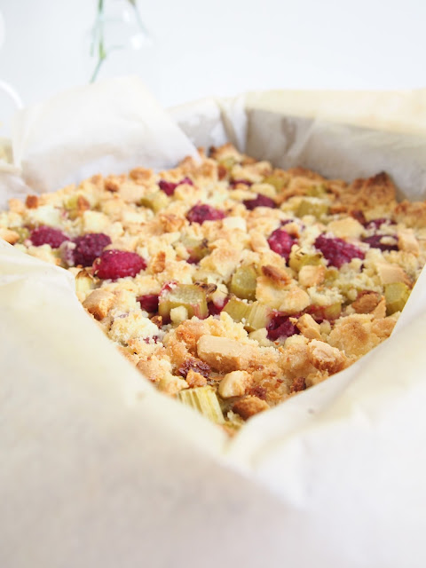 3. Ripottele muruseosta pieni määrä vuokaan ja sitten lisää raparperi ja vadelmat. Levitä sitten loputkin muruseoksesta marjojen ja raparperin päälle. Paista kullanruskeaksi 200 asteessa, eli n. 15-20min uunista riippuen