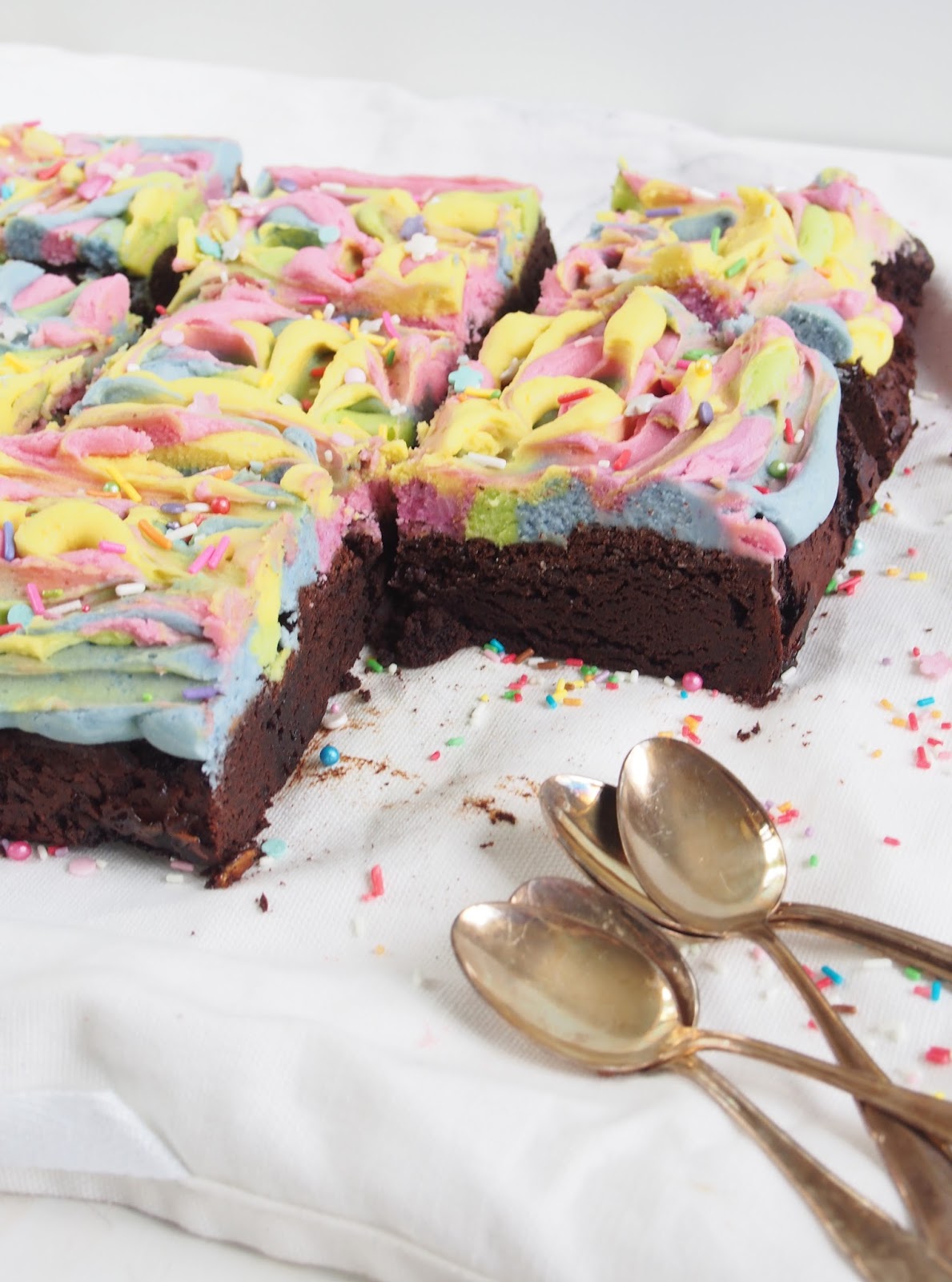 Ehkä näin värikkäisiin browniepaloihin sopisi myös nimitys unicorn brownies? Joka tapauksessa kun vappu koittaa 10 päivän kuluttua, nämä saivat nimekseen vappubrownies! 🙂
