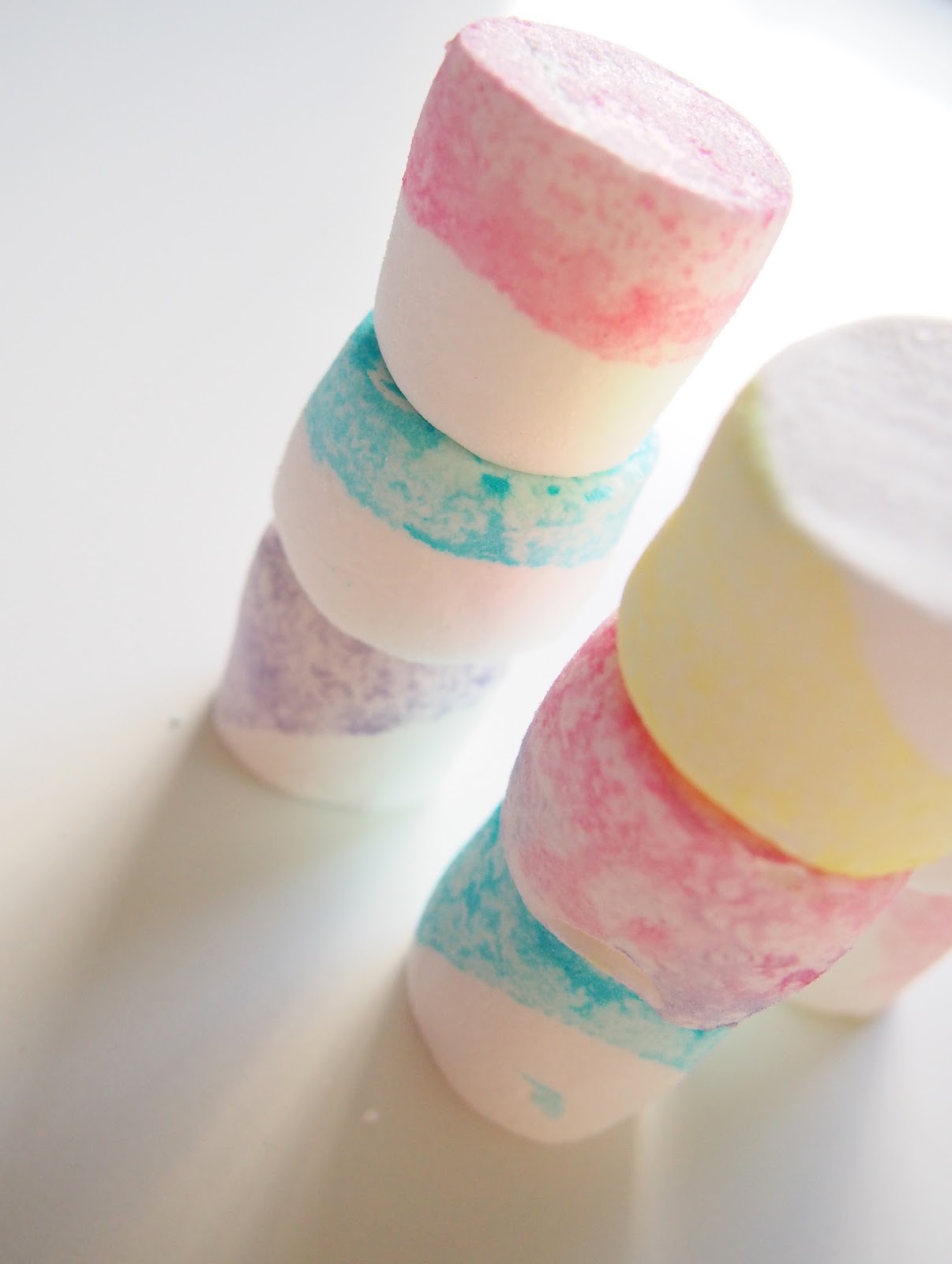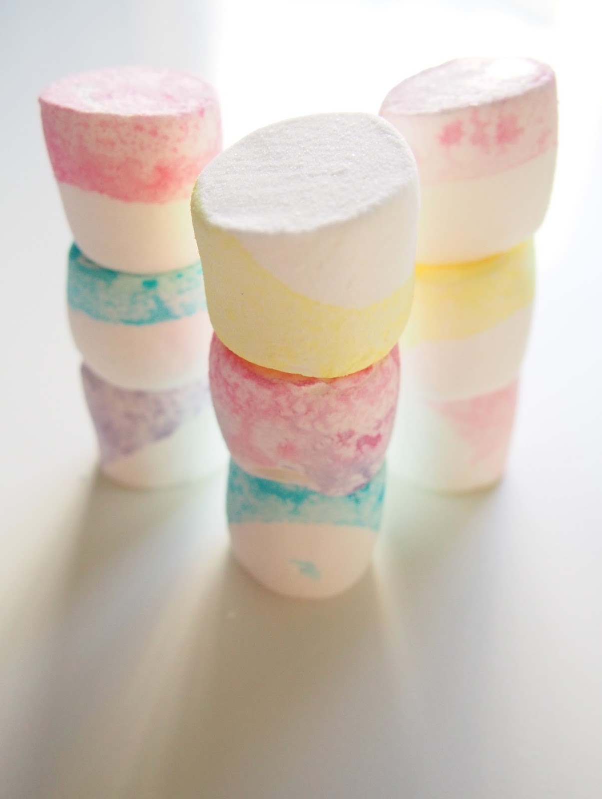 Nyt ei ole vuorossa varsinainen resepti, vaan tuunausvinkki juhlapöytään. Joskus on vaikea löytää oikean värisiä karkkeja ja tarjottavia juhlapöytään. Tällä simppelillä niksillä saat värjättyä vaahtokarkit haluamaasi sävyyn! Värituloksesta tulee vähän vesivärimäinen, meistä todella kaunis!