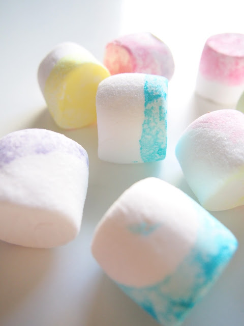 2. Dippaa vaahtokarkit väriveteen, annan niiden olla pinnan alla n. kymmenen sekunnin ajan ja nosta kuivumaan leivinpaperille tai ritilälle n. 20 minuutiksi. Jos kuivatat ne leivinpaperilla, muista kääntää ne jossain vaiheessa toisinpäin, jotta pohjakin kuivuu.