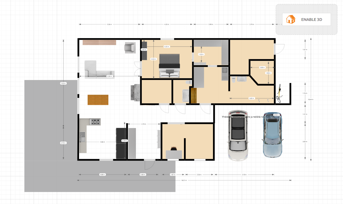 Nyt päätimme, että master bedroomin lisäksi tarvitsemme työhuoneen sekä vierashuoneen, jossa mieheni saa rauhassa pelata pleikkaria. Ensi suunnitelmien jälkeen totesin, että sallitut neliöt paukkuvat sen verran yli, että päätin yhdistää työ/vierashuoneen yhdeksi isoksi huoneeksi, joka on jaettu kevyellä väliseinällä osittain.
