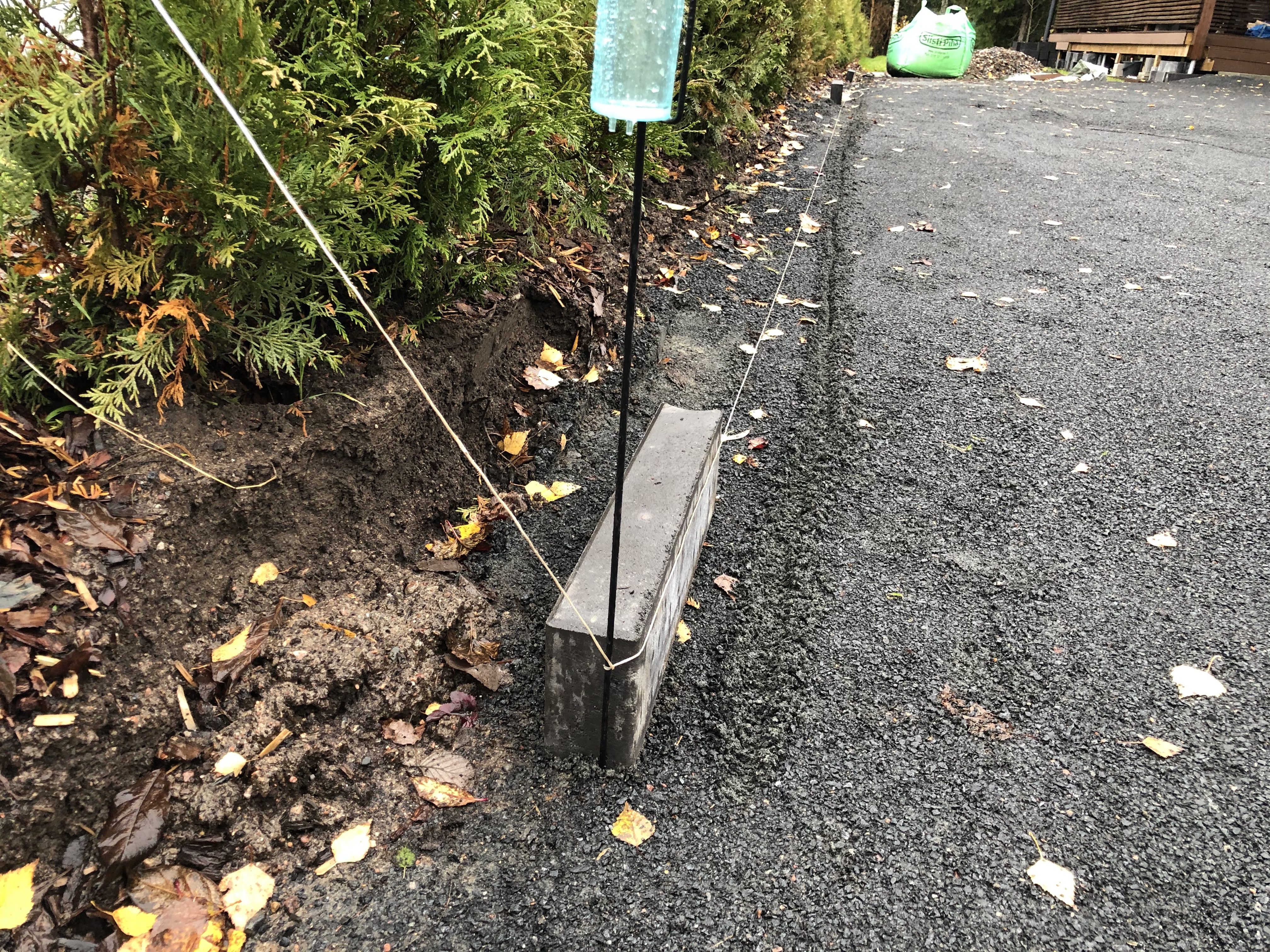Lisäksi laittelimme osan Rudukselta hankituista reunakivistä paikoilleen. Loput jää kyllä keväälle, sillä tuo kylmän kostea ilma ei houkuttele tekemään kuin vain ihan pakolliset hommat. Meillä olisi haaveissa vielä saada tämän vuoden puolella lopputarkastus tehtyä ja se on tehtävä ennen lumien tuloa.