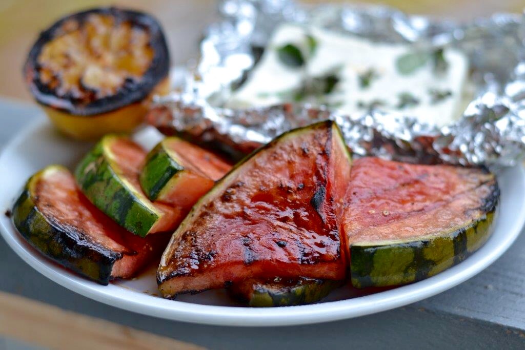 Leikkaa vesimeloni noin 2cm paksuisiksi viipaleiksi. Sudi vesimeloni viipaleihin öljyä ennen grillaus. Grillaa vesimeloniviipaleita muutaman minuutin ajan molemmilta puolilta. Grillaa sitruunan puolikasta grillissä leikkauspinta alaspäin noin 15 minuuttia.