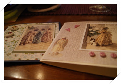 Illalla askarreltiin, sisko perinteisesti joulukalentereita, minä kortteja. Tänä vuonna teen yksinkertaisemmat kortit kuin viime vuonna, mutta nostan itselleni vähän hattua kun ehdin kortteja itse edes tehdä.:)
