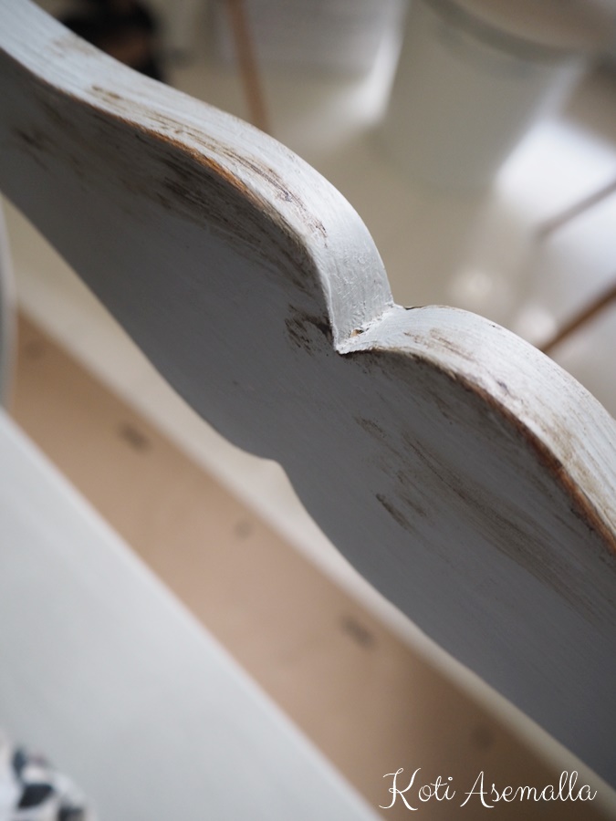 Seuraavaksi hioin hiukan kulumaa tuoliin. Kulmiin, jalkojen reunoihin, selkänojaan, hiukan istuinosaan…. Jos jostain lähtee liikaa, voi maalia sutaista uuden kerroksen päälle, odottaa hetken ja jatkaa taas työtä. Myös mahdolliset maalinvalumat voi tässä kohtaa hioa pois.