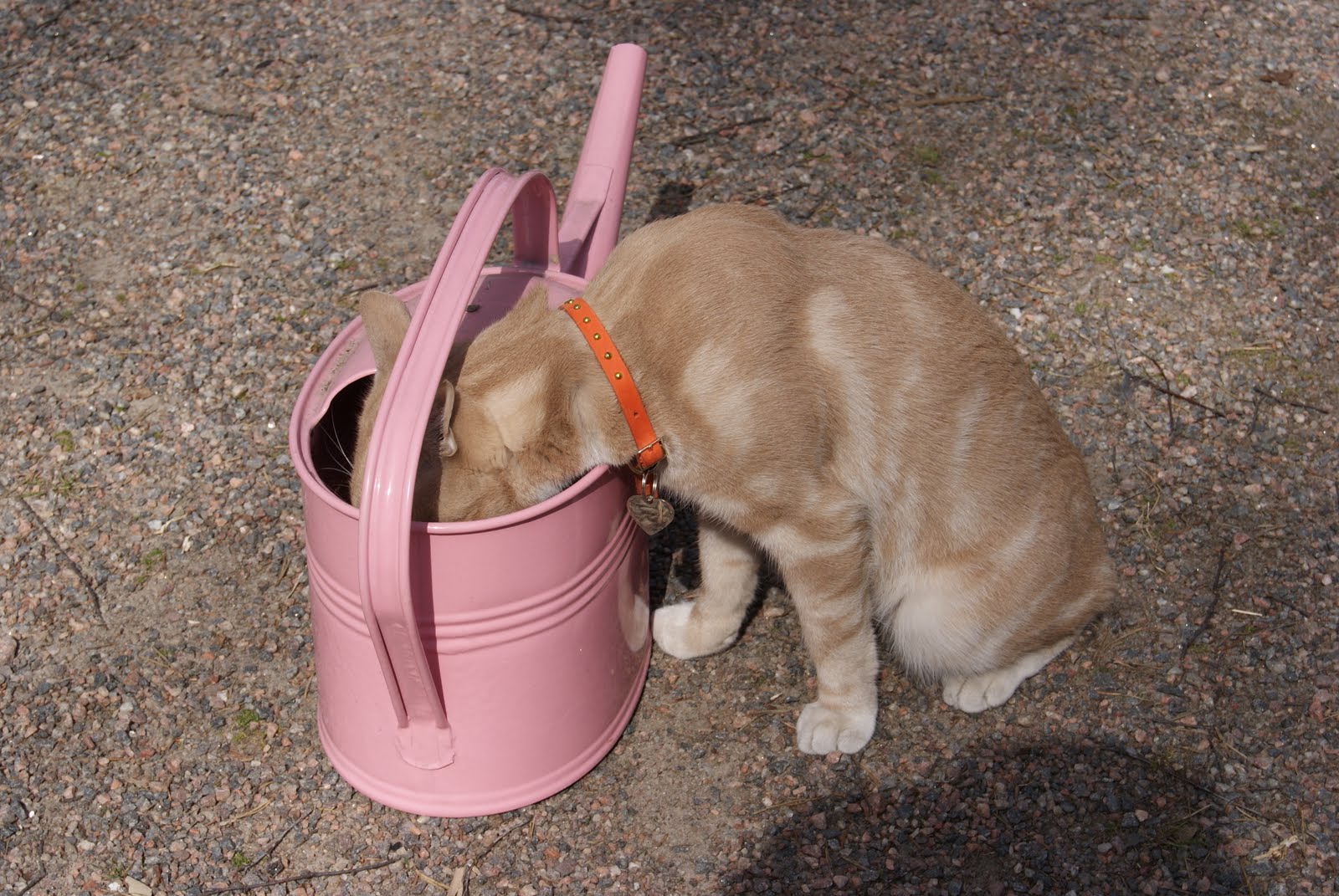 Eppu juo kastelukannusta ja minä odotin kiltisti ennen kuin pääsin antamaan kukille vettä.