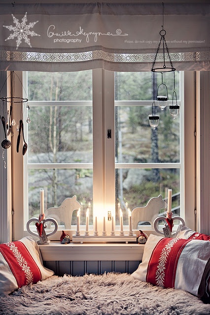 Yllä oleva ikkunakuva on kiva koska siinä on niin perinteiset jouluvärit joista tykkään aina. Jouluna pitää olla punaista, siitä ei pääse mihinkään. Lisäksi ajattelin kokeilla tehdä tuollaisen mun arvontapalkinnon tyylisen koristeen tuossa vasemmalla ylhäällä.