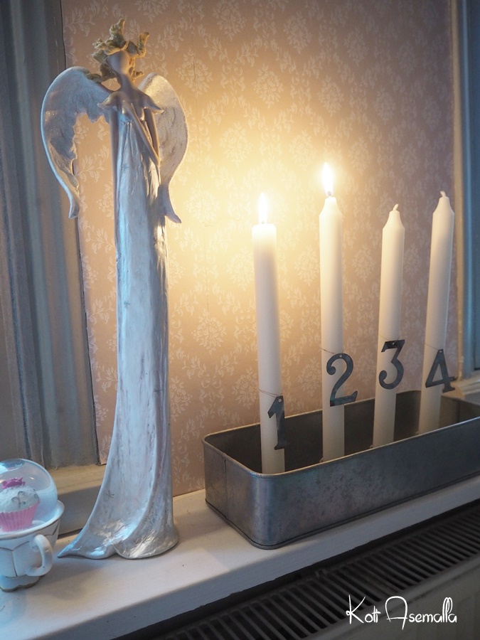 Viime viikolla jäi ensimmäinen adventtikynttilä sytyttämättä kun olin laivalla. Sanoin Mikille että muistavat sitten isän kanssa sytyttää sen, mutta varmaan voitte arvata että eihän ne miehet muistanut. Nyt ollaan kuitenkin kaikki kotona ja molemmat kynttilät palaa.