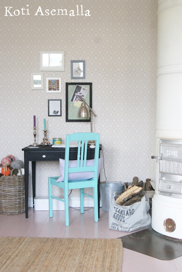 Loppuun vielä, että suosittelen kaikille laiskoille siivoojille sisustusblogin aloittamista. Tuo työtila ei näyttänyt tuolta vielä äsken. Kun siirsin johdot laatikkoon, samalla imuroin, korjasin pahvivuoret puulaatikoiden päältä (miksi ne pitää kerätä siihen kun ei niitä kukaan kesällä polta?), korjasin koiran ja lasten lelut, ja hain halkoja, ihan vaan koristeeksi. Toivottavasti niitä ei oikeasti tarvita vielä pitkään aikaan!
