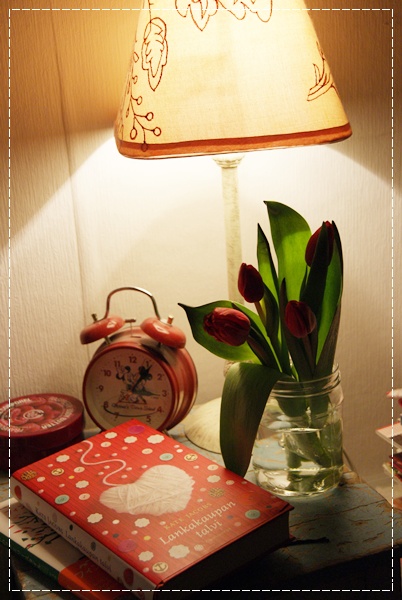 Makuuhuoneessa on tulppaaneja ja kuppeihin pääsi uudet hyasintit. Voi että miten kasvit voivatkaan tuoda kodikkuutta!