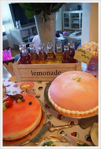 Kaikki oli niin kaunista ja juhlat aivan iloisen siskoni näköiset. Teemana oli värikkyys, leikkisyys ja herkut. Pöytäliinoina H&M Homen ihanaa muffinssi-teemaa, tarjolla prinsessakakku, värikkäitä muffinseja ja siskon lemppareita, Herra Hakkaraisia (limua). Tätä Jasminella oli mm. mun polttareissa kun muilla oli Fresitaa.:D