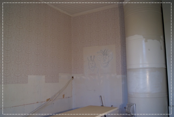 Huone muuttui silmissä, kamala iso “TERVE” teksti ei paista enää seinässä. Tuo tagi paistoi isona ja rumana nurkkahuoneen seinässä, kuin huonona vitsinä. Tosin tuossa toisella seinällä paistaa vielä vähän nuo naamat. Se kun on keittiön ainut seinä johon tulee seinäkaapit niin siihen ei tarvinnut tapettia.