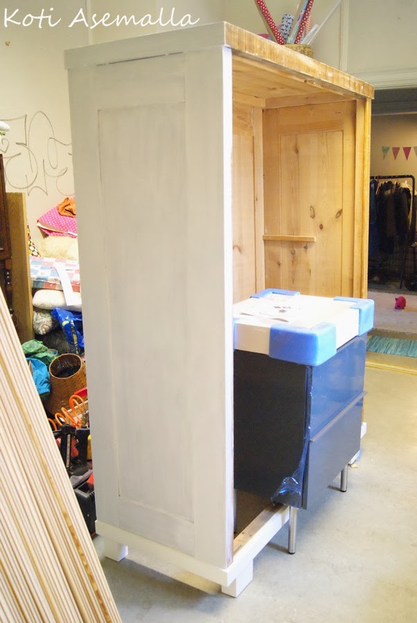 Mikin vaatekaappi on myös työn alla, sekin aiheutti vähän pulmia. Ensin meinasin maalata pellavaöljymaalilla kaikki osat erikseen. Kuivuminen kuitenkin kesti ikuisuuden ja kissat hyppi märän työn päällä. Lisäksi maali olikin kiiltävää, mitä en halunnut! Lopulta illan hämärässä kasattiin kaappi, minä kaivoin tutun ja turvallisen Uulan into-kalustemaalin ja aloin sutimaan. Nyt tulee hyvä! Kaunis matta pinta. Tuon kaapin ostin pari vuotta sitten ja en ollut sitä kasannut aiemmin. Nyt huomattiin että sen ruuvit puuttuu, kiinnikkeet sisällä on mitä sattuu ym. Hyllyt ja tanko puuttuu, mikä kyllä oli tiedossa. Tekemistä siis riittää vielä tuossakin! Sisältä se jää tuollaiseksi käsittelemättömäksi. Vielä kun keksisi millä ne hyllyt käsittelee sopivaksi…