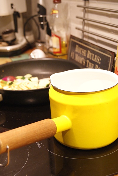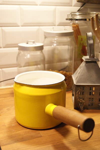 Löysin myös keltaisen hauskan emalisen kattilan jossa on pieni kaatonokka. Vähän epäröin että toimiiko tämä induktioliedellä, mutta toimihan se. Emaliset astiat ja jopa rautainen lettupannu toimii, ihme kyllä. Onneksi! Kyllä on niin pirtsakka kapistus tämä että olisi sääli jos sitä ei voisi käyttää.