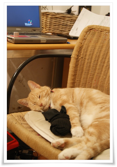 Meidän Epun lempipaikka. Samin työtuolilla, isännän hikisukkien vieressä.:D