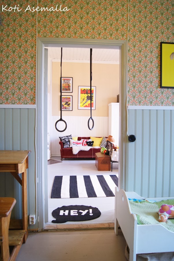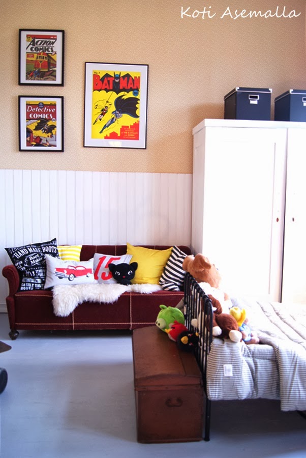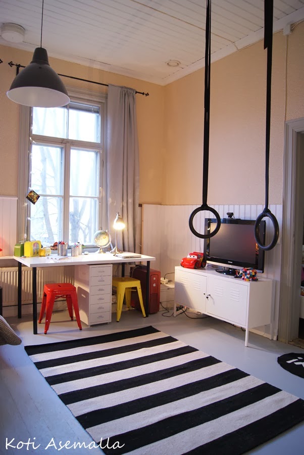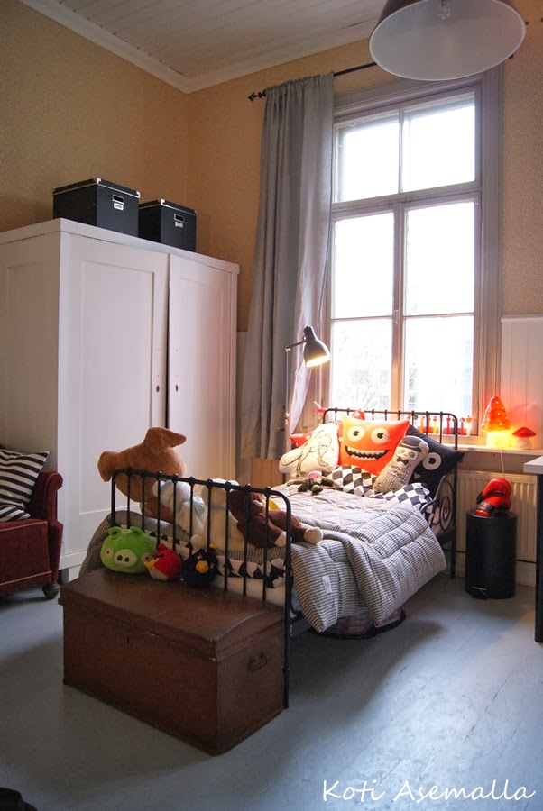 Vaikka pojankin huoneessa vallitseva musta-valko-keltainen värimaailma onkin nyt muotia, väittäisin että tämä on kuitenkin vähän erilainen, uniikki. Oman lisänsä toki tuo vanhan talon ikkunat, puulattiat ja korkea katto.