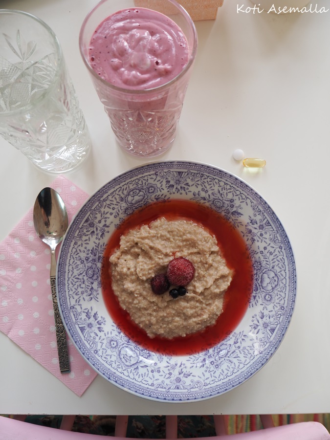 Syön joka aamu kaurapuuroa. Ennen vihasin puuroa, mutta raskauden loppumetreillä tuli puurohimo, joka jäi. Syön siis aamulla puuroa, usein rahkaa, marjoja, kuitulisää. Vaihtoehtoisesti teen smoothien jossa rahkan korvaan raa´alla munan valkuaisella. Siitä saa proteiinia eikä se maistu miltään smoothiessa. Tällä aamupalalla jaksaa pitkään, enkä nykyään voi aloittaa aamua ilman.