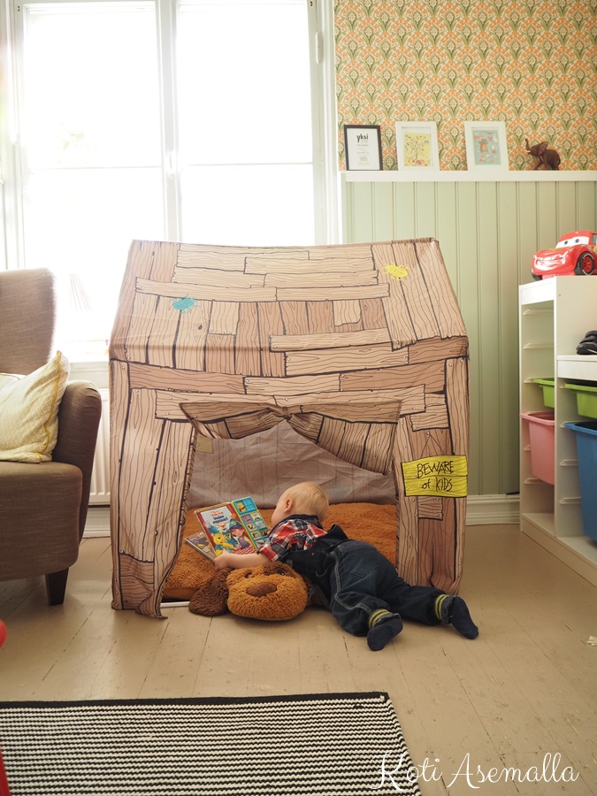 Meidän päivät meneekin usein niin että Nestori kaivaa huoneen läpi, mä vahdin vieressä kutimet tms kädessä, sitten poika siirtyy seuraavaan huoneeseen jne. Usein myös luetaan kirjoja tuossa Nestorin huoneen nojatuolissa tai majassa. Sen hetken kuin poika nyt malttaa olla paikallaan.