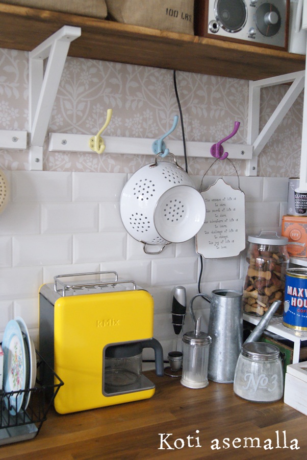 Samalla kun puunasin, vähän vaihdoin järjestystä, kahvinkeittimet lähemmäs toisiaan jne. Kovasti kaipaisin sitä erillistä tasoa kahvinkeittimille jotta saisi tuohon ruoanlaitto-alueelle tilaa. No josko sen syksyllä ehtisi tekemään…