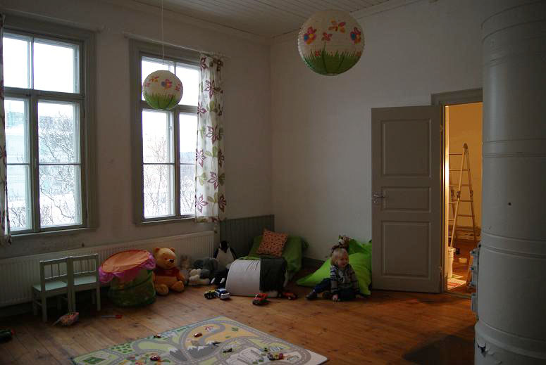 Tuo taustalla näkyvä keskeneräinen huone on tuleva olohuone. Sinne tarvitaan vielä kerros maalia seinille, patteri pitäisi maalata jollain, ikkunat ovat korjauksessa, ikkunanpielet pitää maalata, pönttöuunissa graffiti, jalkalistat irti seinästä, tuollainen vihreä puolipaneeli mikä lastenhuoneessa, revitty puoliksi irti ja palat siitä ties missä…ym. eli hommaa riittää sielä vielä…Muutenkin se huone on jotenkin ankea kun laudatkin vielä ikkunoissa. Tekisi mieli vain majailla nyt valmiissa lastenhuoneessa mieluummin…