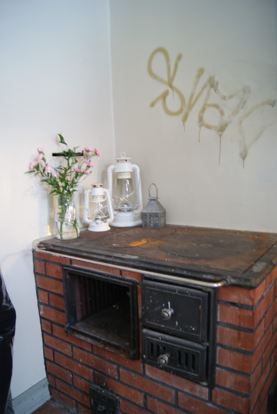 Vielä yksi graffiti seinällä, likainen puuhella josta luukku kadonnut, vieressä jätesäkillinen roskia…:D Tuo graffiti oli hankalin, kun ei lähde pois pesemällä ja meidän maali on vähän väärän sävyinen jotta voisi vaan osan seinästä maalata. Koko seinän maalaamisessa olisi taas iso työ. No äitipä keksi: Liitutaulumaalilla maalataan tuohon ruutu päälle! Jee, mahtavaa! Sitä huomenna kokeilemaan!:)