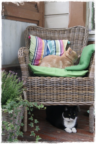 Tämä yläkuva kuvastaa tavallaan hyvin eilistä. Oli taas niin kuuma että kissat vain makoili pitkin nurkkia. Tämä erikoinen paikka taitaa olla aika viileä.:)