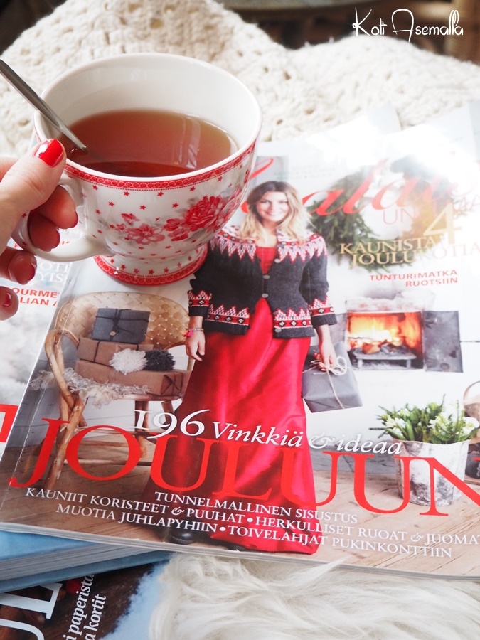 Kävin ullakolta koluamassa vanhat joululehdet alas, metsästin ikuisuuden tuota viime vuoden Teresa Välimäen joulukeittokirjaa ja löysin hiukan jouluteetäkin. Ajattelin että pieni joulufiilistelyhetki divaanin pohjalla olisi oikein hyvä tähän kohtaan kun Nestorikin nukkuu.