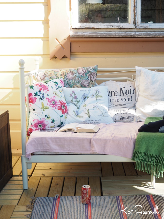Ullakolta sattui vielä löytymään noita isoja tyynyjä jotka olin jo ihan unohtanut. Nyt meillä on todella mukava sohva ulkona. Tykkään ettei tuo tila ole liian stailattu niinkuin meillä sisällä tuppaa vähän olemaan kaikki aika tarkkaan mietitty. Tyynyjä sieltä sun täältä, kalusteet saatu kanssa sieltä sun täältä. Vanhat räsymatot lattialla, ja lavatkaan ei ole täydellisen kokoiset.