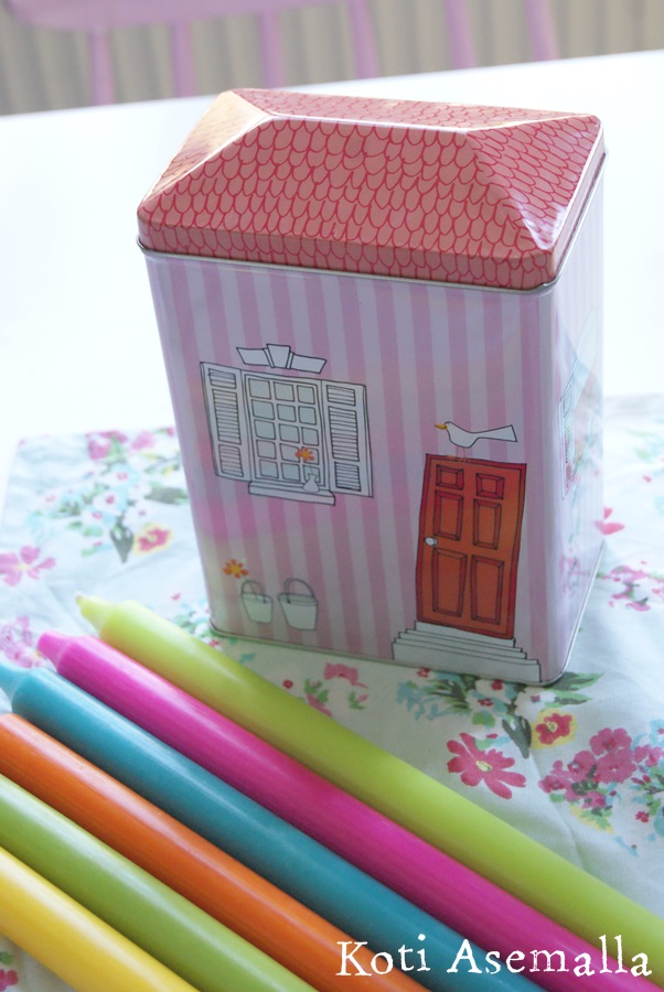 Me teimme tänään lasten ja äitini kanssa pienen visiitin Helsinkiin. Täytyikin heti tulla vinkkaamaan Tigerin uutuuksista. Kaikille mun kaltaisille taloaiheista hullaantuneille, Tigeriin oli just tulossa yläkuvan taloja. Niin hauskoja! Peltitaloja, pahvitaloja, servettejä, tyynyjä… Mä otin peltitalon joka olikin vaikea valita kaikkien kivojen joukosta. Jossain lehdessä oli samaa sarjaa teepannun myssy jonka olisin halunnut mutta sitä ei vielä ainakaan ollut.