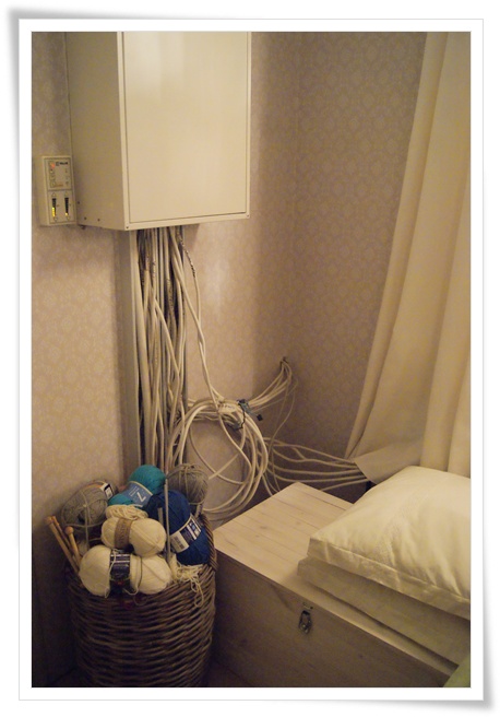 Nuo johdothan meni eläinklinikan takia seiniä pitkin sellaisessa rumassa metallisessa kotelossa joita toimistoissa näkee. Metallihässäkät lähti ja olemme joutuneet pähkäilemään että mites ne johdot piilotetaan. Lastenhuoneessa johdot jäi hyvin paneloinnin taakse, keittiössä sama juttu. Olohuoneeseen ei tullut paneeleja joten juttu onkin hankalampi. Päätimme kuitenkin laittaa johdot samanlailla kuin ennen, mutta teemme puusta johdoille koteloinnin. Pääosinhan se kotelo kulkeekin ikkunalaudan alla piilossa. Tuossa kun on ikkunoiden eli melkein koko seinän levyinen ikkunalauta.