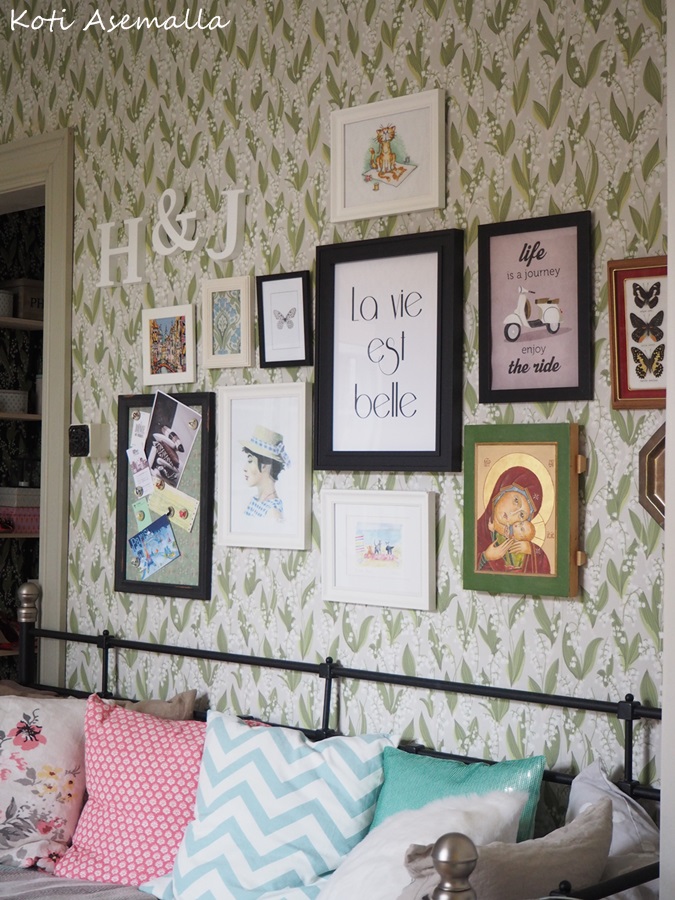 Mä en tiedä olenko laittanut tänne vielä kuvaa tuosta mun huoneen ns. valmiista tauluseinästä. Tuo “La vie est belle”-taulu on myös sieltä Deseniolta josta postailinkin vähän aikaa sitten. Tuollainen sekalainen seinä, jota on muuten pirun vaikea kuvata kun ikkuna on just vastapäätä heijastamassa.