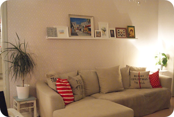 Meille tulee nähtävästi vuoden alussa heti lehtikuvaaja tänne, ja musta tuntui että haluaisin jotain täällä vielä laittaa ennen sitä. Tyhjät seinät näyttää todella tylsältä kuvassa vaikka olisi kuin kiva tapetti alla…