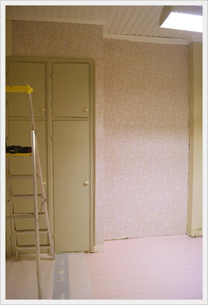 Kuvista näkee tosi huonosti miltä näyttää, mutta olen todella tyytyväinen. Miestä vähän epäilyttää, kuulemma hirvittää onko liian kirjava/vaaleanpunainen kun tällä kaikki seinät tapetoidaan. Itse uskon että tästä tulee hyvä! Kaikki näyttää kuitenkin niin erilaiselta kun listat ja huonekalut ovat paikallaan. Oikeassa kuvassa näkyy hiukan oikealla muuriseinää. Sen kohdalla on ollut ennen puuhella. Tarkoituksena on maalata tuo muuriseinä luonnonvalkoiseksi, jospa sekin vähän raikastaisi tätä vaaleanpunaista tunnelmaa. Ovet ja ikkunanpielet saavat jäädä täälläkin vihreäksi.