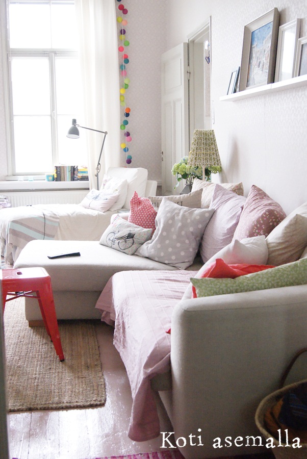 Asiasta viidenteen, mä laitoin tähän kuvan olohuoneesta, koska olen vihdoin melko tyytyväinen siihen. Kun muutettiin tänne, olkkari oli vielä aika tylsä kun täällä oli se meidän sänkykin, mutta nyt sängyn poistuttua, olen muokannut sitä vähän uusiksi. Divaani, työpöytä ja värikkäät tekstiilit sohvalla on tuonut kivaa tunnelmaa ja väriä tänne. Sohvapöydänkin tilasin Ellokselta, mutta niillä oli 2,5 kk toimitusaika sille, joten peruutin koko jutun… Ihan älyttömäksi menee nuo toimitusajat… Eli täytyy taas etsiä toista vaihtoehtoa.